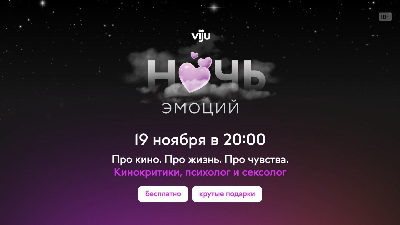 Сразу предупреждаем: не ждите трогательных моментов, слёз счастья и хэппи-энда. Тема – «viju ночь эмоций: всё о любви» – обещает быть глубокой и многогранной. Разговор пойдёт о разных спектрах этого чувства – от здоровых и гармоничных отношений до разрушительных и болезненных.